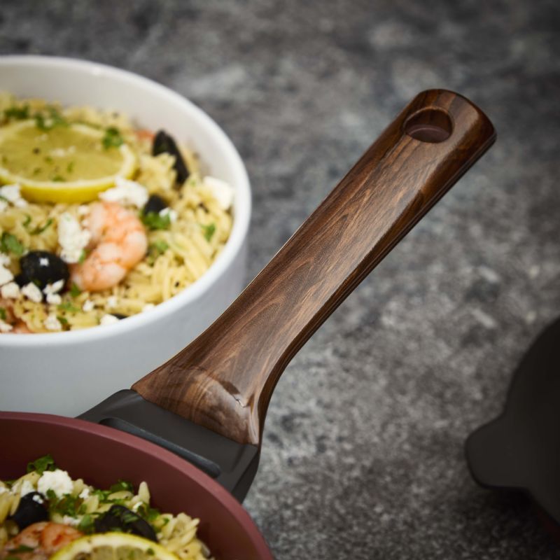 The lightweight aluminium construction heats up quickly and distributes heat evenly, helping you achieve perfect results without wasting time. Non-stick interiors reduce the need for excess oil, making your meals healthier and cleanup effortless. Each piece is finished with heat-resistant wooden handles that stay cool to the touch, offering comfort and safety while adding a stylish accent to your cookware.